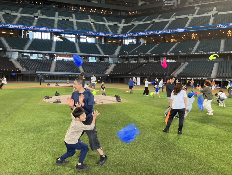 元プロ野球選手とファイターズガールと一緒に、親子で楽しく身体の動かし方を学べるフィジカルアカデミーを実施しました!普段試合が行われているグラウンドという特別な舞台で参加した40名は興奮した様子で、笑顔で身体を動かして楽しみました!